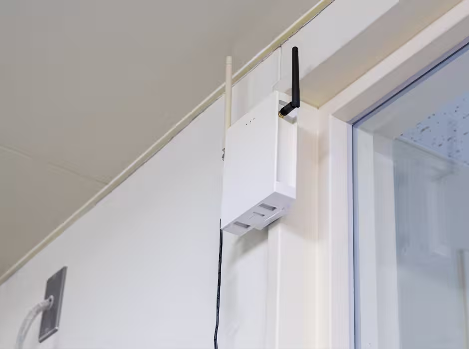 - 冷蔵庫内に設置したキッチンリンク・クラウドの子機(上左写真)と、厨房内に設置した親機(下右写真)