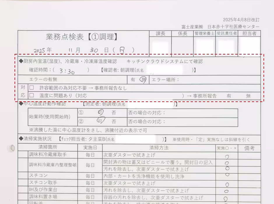 - 給食調理の業務点検表。赤枠内が温度のチェック部分です。キッチンリンク・クラウドは冷機器の庫内温度だけでなく、室内の温度と湿度を計測できるため、室温と湿度についても確認をしています