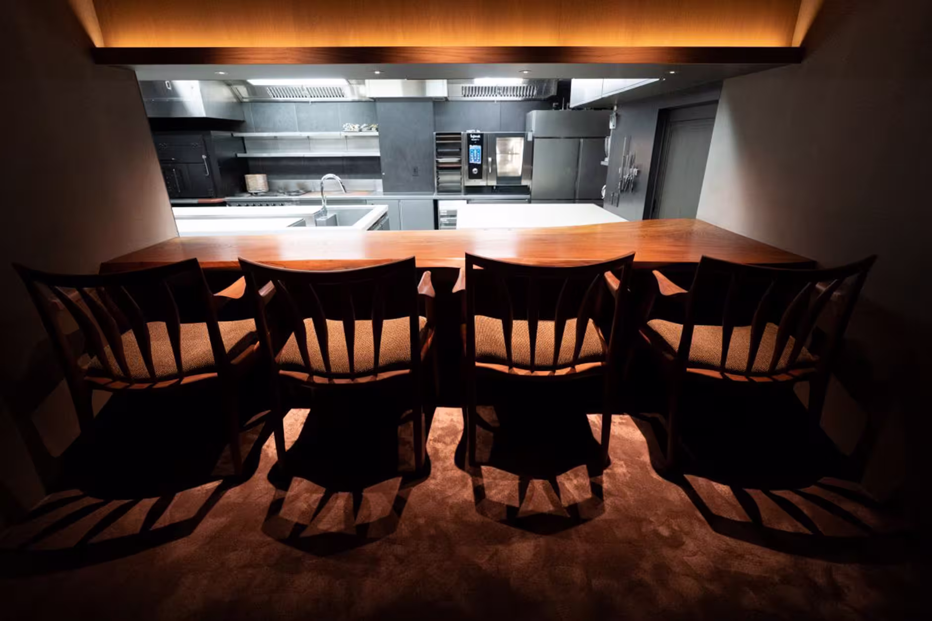- シェフズテーブル。料理人たちの調理風景を眺める額縁が目の前に広がっているような感覚を味わえます
