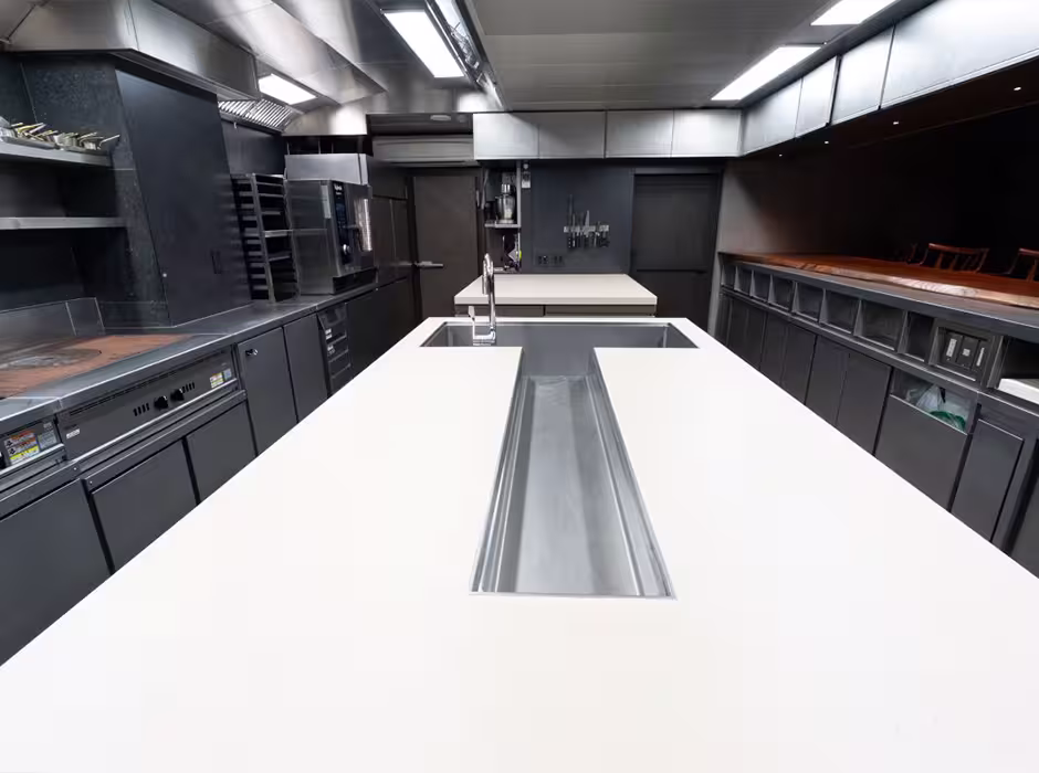 柴田シェフがドリームチームを率いて最高出力を出す厨房は、fujimakが設計と施工をお手伝いしました。清潔感のある白と引き締まった黒、そしてベース色のグレーがバランス良く配色されており、機能性と安全性、スタイリッシュな美しさを兼ね備えた、品格のあるキッチンです。