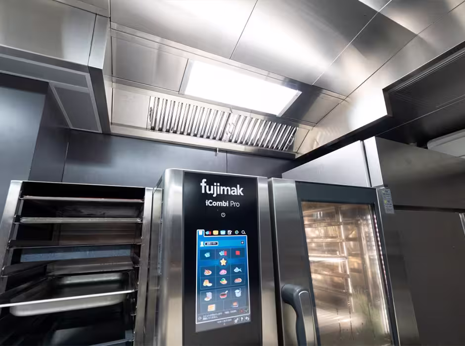 - コールドテーブルの天板センター部にはシンクにつながる溝を埋め込んでいます。右奥がシェフズテーブルのカウンターです(写真左)(写真上)。排気天井システムやコンビオーブンも採用いただきました(写真右)(写真下)