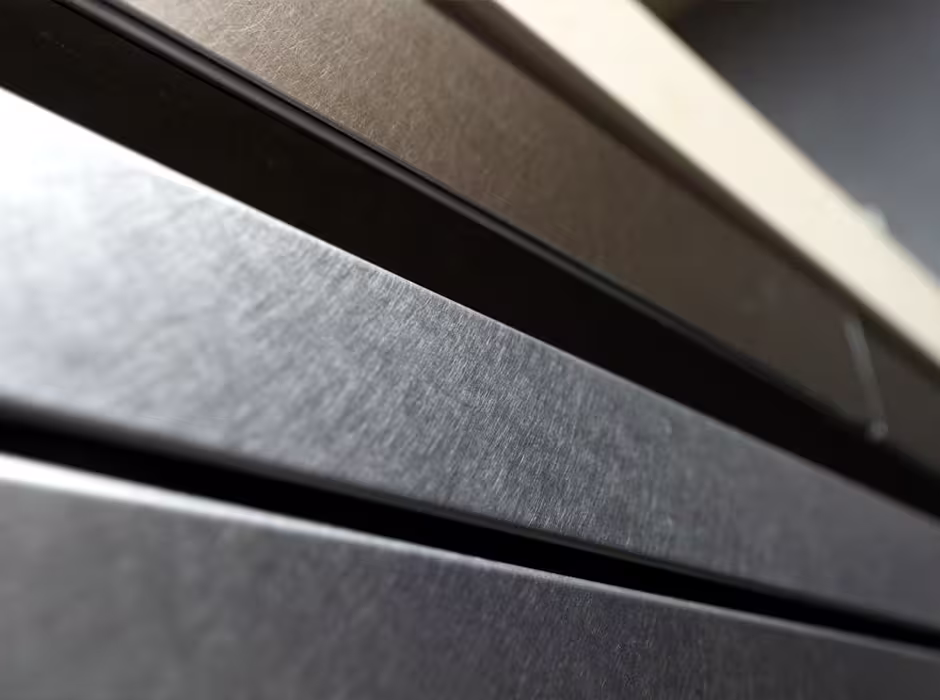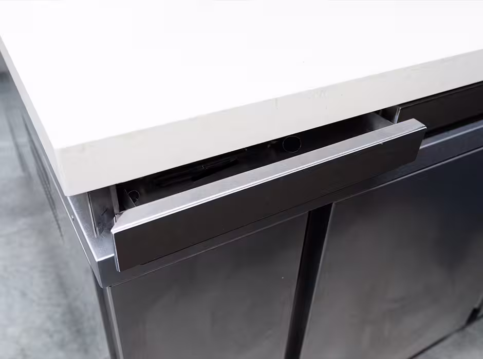 - コールドテーブル表面のステンレスは、品格のあるバイブレーション仕上げ。DEKTON天板との間に、ビンテージカラーのドロワーを設けています