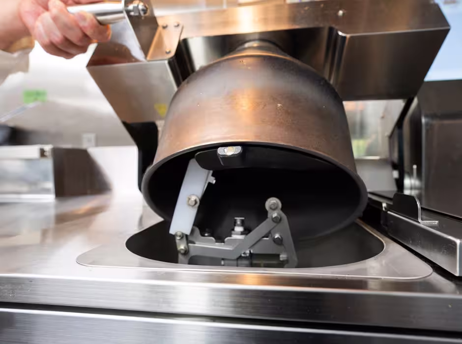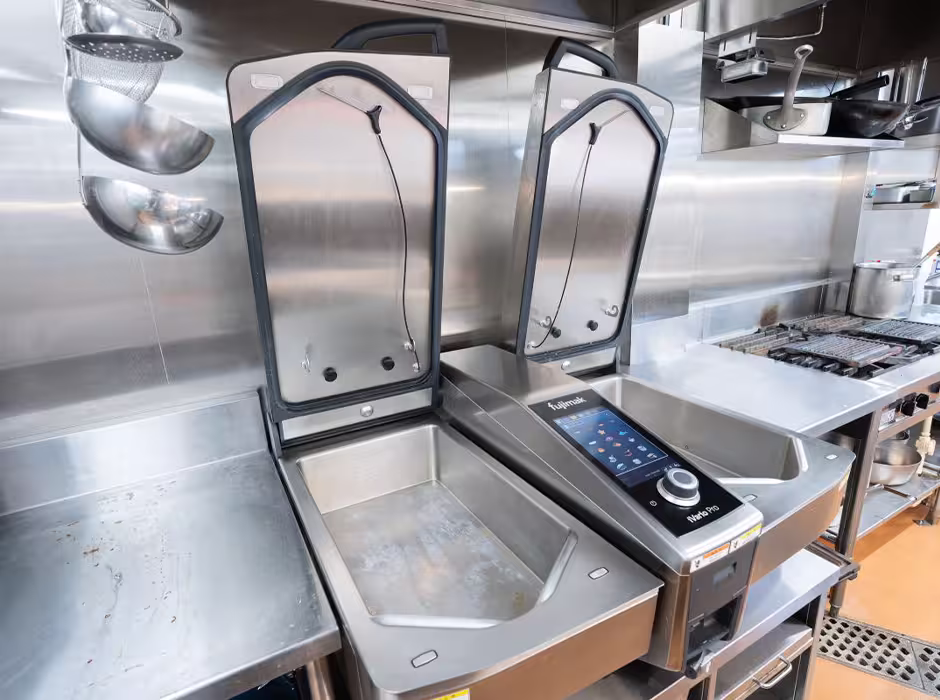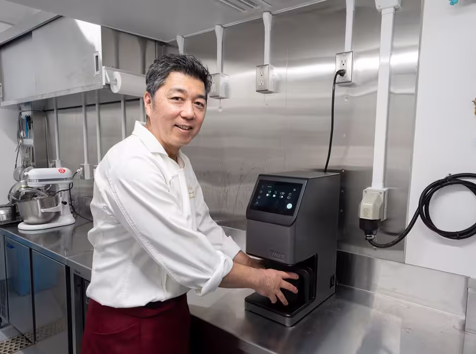「I-Robo 2は、入店初日のスタッフでも操作ができるほど扱いやすいです。この機器は小口のオーダーへの対応を想定したもので、大量調理では、これとは異なる最新機器を導入しています。煮る、焼く、炒めるなど、多用途に使えるバリオ デュアルパンです。高火力で、熱の入り方が均一なのがメリットで、セントラルキッチンだけでなく、フロア内で合計3台を設置しています。若手のスタッフほど器用に使いこなしている印象です」(栗本総料理長)